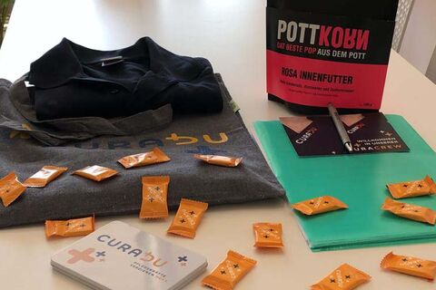 Immer wenn ein neuer Mitarbeiter (m/w/d) zur persönlichen Einstellung zu uns in den Standort kommt, warten ein paar tolle Dinge zum Einstieg auf unser neues Crewmitglied. Neben Curadu-Poloshirts bekommt jeder neue Mitarbeiter einige Werbeartikel unserer Firma zum persönlichen Gebrauch, wie Blöcke, Stifte und Süßigkeiten. Außerdem darf sich auch jeder über eine Tüte Pottkorn freuen.