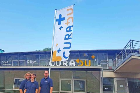 Wir haben vor unserem Büro im TZU II in Oberhausen einen neuen Fahnenmast aufstellen lassen. Nachdem dieser installiert war, konnten wir unsere neue auffällige Curadu Fahne daran montieren und hissen.
